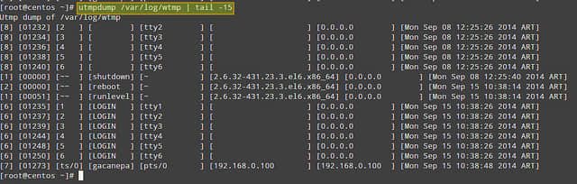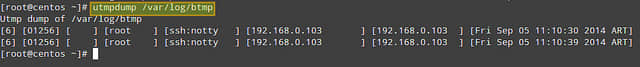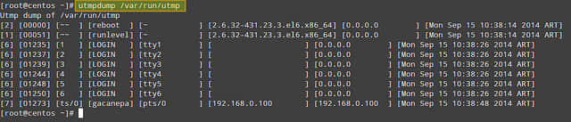 在本文中,我将介绍如何使用utmpdump,这个小程序来自sysvinit-tools包,可以用于转储二进制日志文件到文本格式的文件以便检查。此工具默认在CentOS 6和7系列上可用。utmpdump收集到的信息比先前提到过的工具的输出要更全面,这让它成为一个胜任该工作的很不错的工具。除此之外,utmpdump可以用于修改utmp或wtmp。如果你想要修复二进制日志中的任何损坏条目,它会很有用(LCTT 译注:我怎么觉得这像是做坏事的前奏?)。