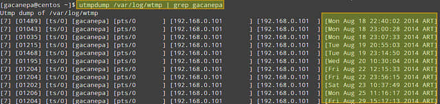 # utmpdump /var/log/wtmp | grep -E "\[7].*gacanepa" | awk -v OFS="," 'BEGIN {FS="] "}; {print $2,$4,$7,$8}' | sed -e 's/\[//g' -e 's/\]//g'