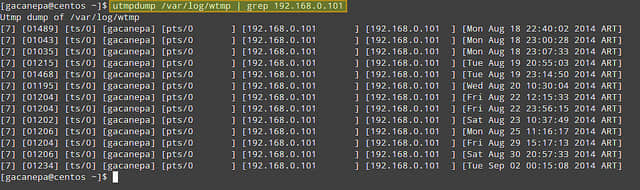 # utmpdump /var/log/wtmp | grep 192.168.0.101