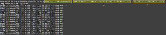 就像上面图片中三个高亮区域描绘的那样,过滤逻辑操作是由三个管道步骤组成的。第一步用于查找由用户gacanepa触发的登录事件([7]);第二步和第三部用于选择期望的字段,移除utmpdump输出的方括号并设置输出字段分隔符为逗号。