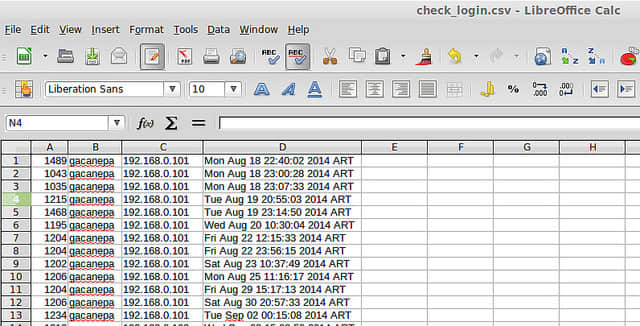 例如,你可以使用以下命令来列出某个特定用户(如gacanepa)的所有登录事件,并发送输出结果到.csv文件,它可以用像LibreOffice Calc或Microsoft Excel之类的文字或工作簿应用程序打开查看。让我们只显示PID、用户名、IP地址和时间戳:
