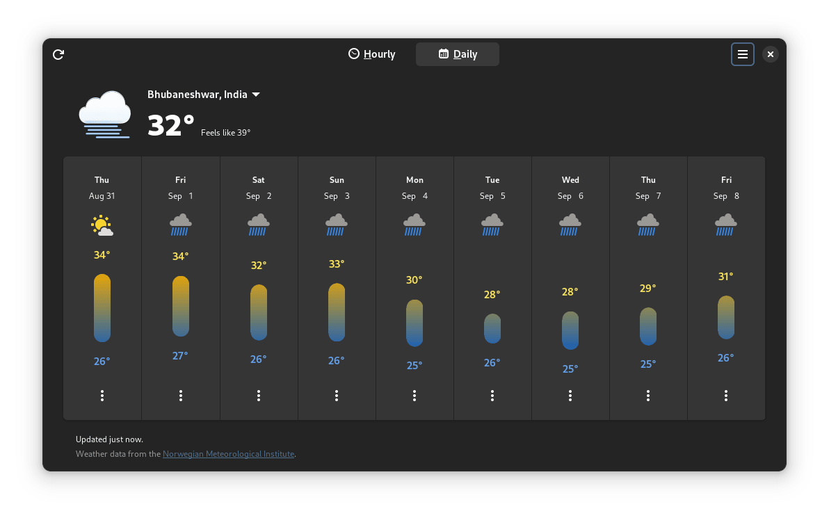接下来是“ 天气 Weather ”应用,其增大了默认窗口大小以容纳所有温度计小部件。这款应用还可以记住你最后一次设定的窗口大小,便于在你下次打开时,直接展示该大小。